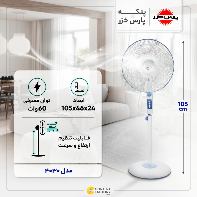 ساده، پرقدرت و ایمن برای روزهای گرم تابستان ❄️🌬️🔹 ویژگیها:توان مصرفی: حداکثر ۶۰ وات (کممصرف)ولتاژ: ۲۲۰ ولت متناوب / ۵۰ هرتزحجم باددهی بالا: ۵۶ مترمکعب بر دقیقهکلید تنظیم سرعت در سه حالت: کند، متوسط و تندمجهز به گارد محافظ ایمن با طراحی میلهای🔹 مزایا:خنککنندگی مؤثر و یکنواختطراحی مقاوم و بادوامکاربری آسان با تنظیم سرعت سهحالتهایمنی بالا برای استفاده در خانه و محل کارگارانتی ۲۵ ماهه رسمی پارسخزر